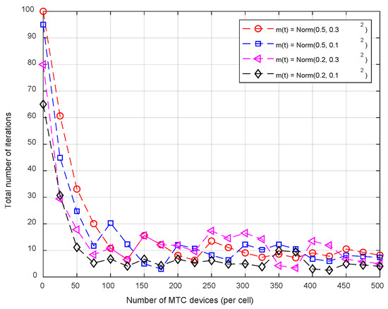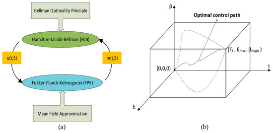 Game theory helps by determining strategic interactions as well as by providing a depiction of the rational behavior of users and the design of a distributed approach for a reliable solution. Resource management can be implemented efficiently by modeling a given network scenario as a game, with the players being the users in contention for different resources. A hierarchal game model for optimal resource allocation in a heterogeneous network was proposed [19]. Two non-cooperative sub-games were played sequentially in an attempt to overcome the problems of interference management and user rate maximization, respectively. Users optimized their connectivity with either a femtocell or macrocell based on a tradeoff between experienced interference and minimum rate requirement. Optimal power allocation schemes using game theory design to maximized user utilities for two-tier femtocell, ultra-dense and NOMA networks were proposed [20,21,22]. Interference coordination was achieved for device-to-device (D2D) links underlying cellular network using a distributed power control scheme [23]. A power control design with Nash equilibrium (NE) was designed for each link to guarantee interference minimization. Utility function modeling and reaching a stable equilibrium for a large number of users becomes increasingly difficult. Conventional game theory models cannot be used for massive user networks and advanced game models are required to efficiently design and model user behavior to reach a converged solution strategy. MFG is an advanced game theory framework a mean field characterizing the space-time dynamics, i.e., a player can make an optimal decision by only conforming with the mean field, instead of consulting the strategies of every other player in the game. MFG decision making is distributed with reduced information and control overheads [24,25,26,27]. MFG becomes more relevant for a large number of players as mean field approaches to a real value for increasing number of players [28,29,30,31,32]. Many works have been reported in which MFG theory is utilized to optimize energy utilization [33] and medium access control of devices [34]. However, no prior work has focused on utilizing the concept of a mean field for energy efficient resource management and a scheduling solution for MTC devices over a cellular network.