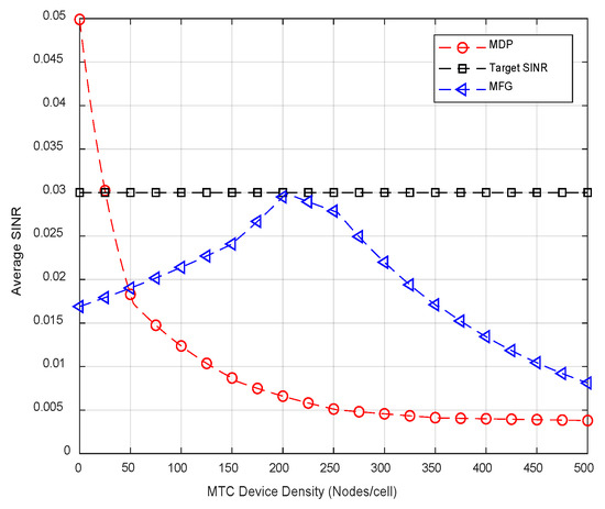 The relationship between energy efficiency, allocated transmit power and the expected battery lifetime is an important one and it is described in Figure 9 and Figure 10 in detail. In the designed simulation environment, the SINR behavior of MTC devices is observed at different densities in the simulated cellular network considering the MFG based optimal power control policy. An increase in average SINR of the MTC users is observed with the increase of user density which can be attributed to increasingly dense network environment causing complex interference to all MTC and HTC users. As already observed, MTC devices tend to increase the allocated transmit power levels to counter this experienced interference. Due to increased MTC user density, the intra-MTC device interference takes the dominant role instead of the HTC device impairments after a certain point in the increasingly dense environment. Hence, an eventual drop in allocated power degrades the averaged SINR specifically for the MTC devices beyond this point in the density SINR graph. This behavior of the coexisting hybrid network environment of HTC and MTC devices ensures that the proposed MFG centered power control scheme can indeed achieve the highest possible SINR for the MTC devices. In comparison to the approaches involving a Markov decision process (MDP) based power control, the proposed MFG-based power control gets a more closely matched average SINR value to the target SINR. One can describe the MDP-based approach as a basic stochastic game design with individual optimal decision policies for each player instead of a global optimal policy for all players. Figure 9 provides a comparison of this MDP-based [42] and MFG-based power control scheme in terms of the averaged SINR according to different MTC device densities and their proximity to the target SINR value. It is clear that the MDP based power control scheme fails to support an increasingly dense MT environment with the expected decrease observed in the average SINR mainly due to increased interference levels. This experiment further highlights the importance of the achievable SINR in different MTC user densities as a key design target to ensure an energy efficient MFG-based power control.