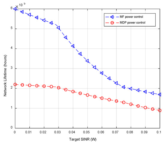 The network lifetime of MTC devices using the SIL design was analyzed with respect to the target SINR value . It is clear from Equation (13) that the required value of Po is directly related to the value of . Hence, the required transmit power needed by MTC devices to achieve their respective target SINR values directly affects their battery lifetimes. A comparative study of the proposed MFG based optimal power control scheme is done with an MDP-based power control mechanism and the results are shown in Figure 10. A decrease in network lifetime is observed for both of these schemes because of the direct dependence of the transmit power level and the value of the target SINR as expressed by Equation (13). The proposed MFG-based approach outperforms the MDP-based design by prolonging the lifetime of MTCDs by a factor of 3 before the optimal threshold value and by almost twice after the optimal value is attained. This proves the effectiveness of the proposed MFG-based design for battery lifetime enhancement for increasingly dense MTC network environment in coexistence with traditional HTC users. The convergence of the coupled system of PDEs using finite difference scheme can converge to an asymptotic NE known as the MFE as discussed in detail in Section 5.