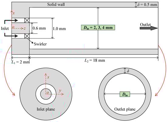 The swirl MC configuration is exhibited in Figure 1. Except for the channel diameter Din, other structural parameters were kept the same. The thickness of the wall (δ) was 0.5 mm. The lengths of entrance section (L1) and combustion chamber (L2) were 2 mm and 18 mm, respectively. An axial annular swirl generator was placed at the entrance section with 6 blades, each of which had a discharge angle of 45°. In addition, the inner and outer diameters of the swirler had values of 0.6 mm and 1.0 mm, respectively. Based on the swirl number calculation of the axial annular swirl generator [], the swirl number was approximately 0.82 in this combustor. Moreover, it should be emphasized that this exact swirler geometry was captured in the numerical modelling and the swirl number did not vary with the inlet mass flow rate. The combustor was made of silicon carbide, which had thermal conductivity and emissivity values of 32.8 W/m·K and 0.9, respectively. Detailed geometrical parameters are shown in Figure 1.
