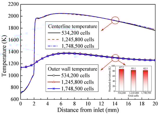The second order upwind scheme and the SIMPLE scheme were utilized for discretizing the equations and the pressure–velocity coupling. The simulation results were considered to be converged when the residual of the energy equation was not greater than 10−6 and the residuals of other equations were not greater than 10−3. Furthermore, the grid independence was checked in a swirl MC with Din = 2 mm under three mesh cells of 534,200; 1,245,800; and 1,748,500 cells in the case of mH2 = 2.16 g/h and Φ = 1.0. The temperatures of the centerline and outer walls are depicted in Figure 2. As it can be observed from the graph, the differences in the centerline wall temperature were small, at the same time, the outer wall temperature profiles of the three cases almost overlapped. In addition, the difference in the standard deviation of the outer wall temperature was really small. Thus, the mesh with the cell number of 1,245,800 was selected as the preferable grid structure in this study. The numerical modelling established in this study was the same as in the literature [,], of which the results were confirmed to be accurate and effective in simulating the premixed H2/air combustion in micro-combustors.