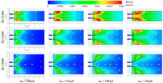 Colored contours of mass fractions of the radical H with overlaid velocity level lines (black line) under various hydrogen mass flow rates at the XZ plane in the swirl MC with different channel diameters.