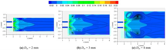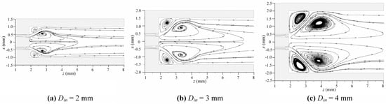 The flow streamlines at the XZ plane in the MC with different channel diameters (mH2 = 2.16 g/h).
