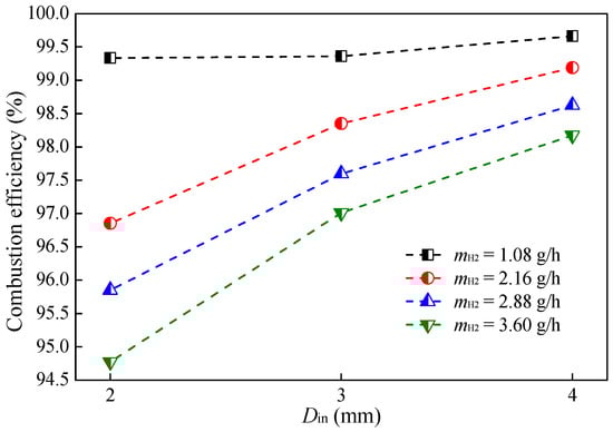 Figure 5 shows the effect of Din on the combustion efficiency under various mH2. It is clear that combustion efficiency decreased with an increase in mH2 due to the increase of inlet velocity, which resulted in a short residence time of reactants. Meanwhile, a large Din can obviously increase the combustion efficiency. For instance, the combustion efficiency increased from 94.77% to 98.17% when Din rose from 2 mm to 4 mm at mH2 = 3.60 g/h. This can be ascribed to the larger recirculation zone, which increased the residence time of reactants. On the other hand, the combustion efficiency in the swirl MC with a large Din is less susceptible to the changes in mH2, as shown in Figure 5. For example, when mH2 increased from 1.08 g/h to 3.60 g/h, the combustion efficiency of Din = 2 mm decreased by 4.56%, while the combustion efficiency of Din = 4 mm only decreased by 1.49%.