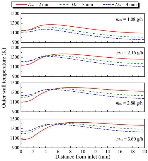 As for the outer wall temperature distributions, they are depicted in Figure 6 under different Din and mH2. At the case of mH2 = 1.08 g/h, Din = 2 mm had the highest wall temperature distribution along the entire wall. However, with the increase of mH2, the outer wall temperature near the inlet of the swirl MC with Din = 2 mm was obviously lower than the swirl MC with Din = 4 mm. This is because there was a corner recirculation zone near the swirler plane and the inner wall of the chamber. The corner recirculation zone was enlarged with an increasing Din, which enhanced heat transfer. Thus, the wall temperature near the inlet increased with a rise in Din.
