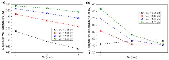 (a) Mean outer wall temperature and (b) temperature standard deviation under different Din and mH2.