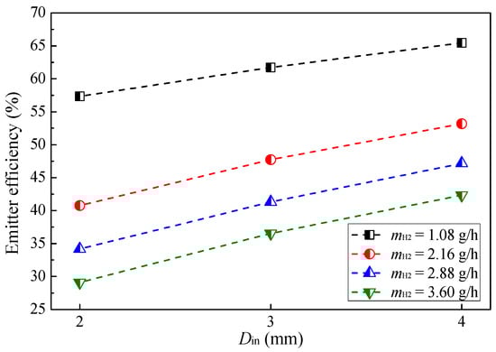 The energy output of the MC is of great significance for the micro thermophotovoltaic power generator. The emitter efficiency ηe is calculated by , where QLHV is the lower heating value of hydrogen which is 119.96 MJ/kg. Figure 8 shows the emitter efficiency of the MC with various Din at different mH2. As mH2 becomes larger, the emitter efficiency decreases. The reason is that in the process of increasing mH2, the heat loss of high-temperature exhaust gas is larger and the combustion efficiency becomes lower. In addition, the swirl MC with Din = 4 mm had the highest emitter efficiency of 65.5% at mH2 = 1.08 g/h, while the emitter efficiency of Din = 2 mm was only 57.3% at mH2 = 1.08 g/h. This is because the radiation surface increased with an increase in Din. When mH2 increased from 1.08 g/h to 3.60 g/h, the emitter efficiency of the swirl MC with Din = 4 mm rose by 14.1%, 30.4%, 38.1%, and 45.4%, respectively, compared to the swirl MC with Din = 2 mm.
