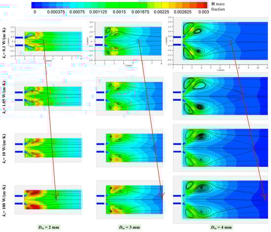Colored contours of mass fractions of the H radical with overlaid flow streamlines (black line) under various thermal conductivities at the XZ plane in the swirl MC with different channel diameters.
