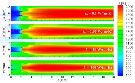 It is recognized that the thermal conductivity of solid walls is considerably related to the flame characteristics of micro combustion [,]. For the purpose of investigating the effect of thermal conductivity, in this section, the density, specific heat, emissivity of solid walls were fixed, just like the silicon carbide. Only the thermal conductivity changed and the values of 0.1, 1.05, 10, 32.8, 50, 100, and 150 were selected to investigate this effect on the combustion and thermal performances. Moreover, mH2 and Φ were fixed at 2.88 g/h and 1.0, respectively.