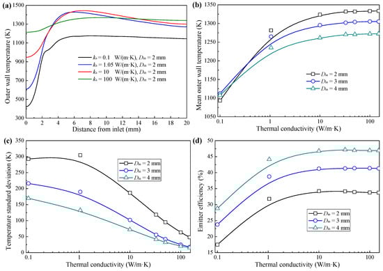 Effect of thermal conductivity on (a) temperature distributions of the outer wall, (b) mean temperature of the outer wall, (c) temperature standard deviation, and (d) emitter efficiency.
