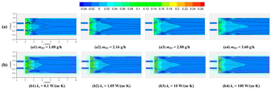 Contours of  with overlaid flow streamlines (black line) for different hydrogen mass flow rates and thermal conductivities at the XZ plane in the swirl MC: (a) effect of hydrogen mass flow rate, where Din = 2 mm; (b) effect of thermal conductivity, where Din = 2 mm and mH2 = 2.88 g/h.