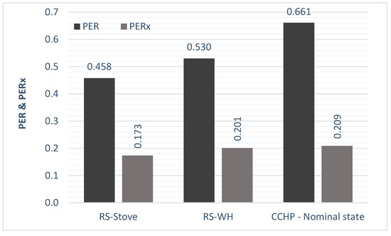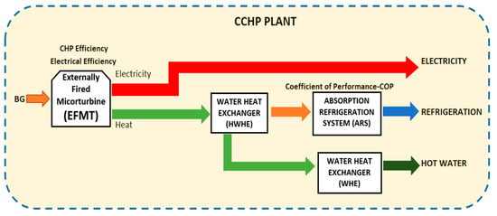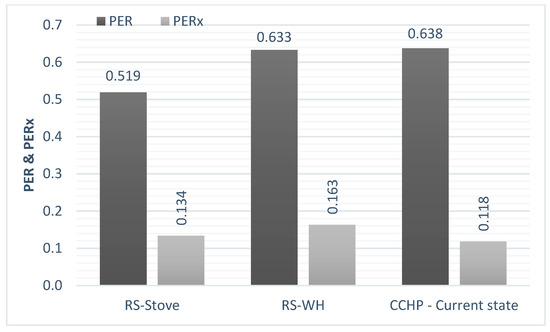 - The overall efficiency of the CCHP solution was calculated once the system was set and the energy services determined. The primary energy/exergy rate ( and ) were found as proper indicators for CCHP overall efficiency [53,54,55]. Similar indicators were used to determine the performance of the reference systems where energy services are produced separately.