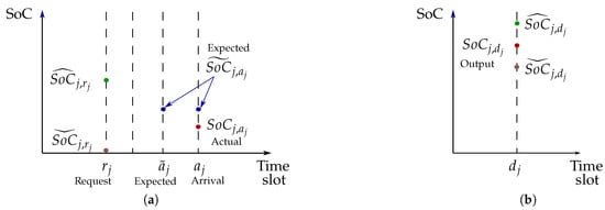 , and the actual SoC at the departure . Then, notice that the actual arrival SoC and the reported SoC at the request are generally different, i.e., (see Figure 2a).