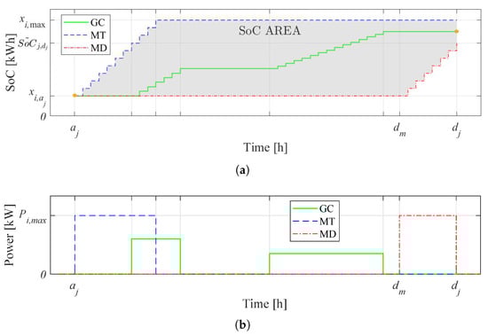 (in this case, no flexibility is possible from to ). Figure 3b depicts the power injected by strategies GC, MT, and MD for creating the SoC area. Note that there are no idle losses due to the short time horizon, and no negative power flows are considered as this work does not take into account V2G applications.In short, the upward flexibility is the capacity of increasing the charging power up to , while the downward flexibility is the capacity of charging with lower power or renounce to charge. Finally, the EV should depart with a charge level