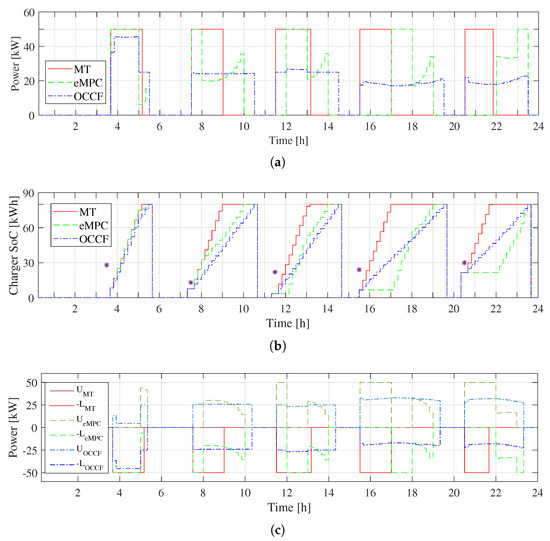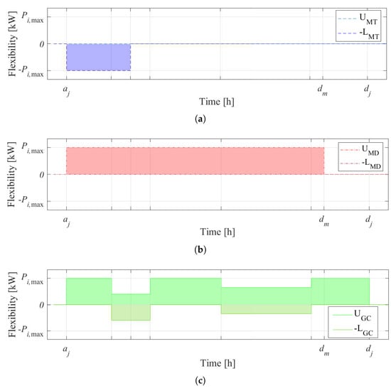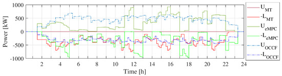 , where corresponds to the full charge condition.In addition, in Figure 4, the flexibility areas for the three strategies are shown, highlighting the upward (U) and the downward (L) flexibility. Although the downward (L) flexibility is positive, for better representation, it is plotted as a negative value to indicate a power reduction, i.e., –L is depicted. In the MT case (Figure 4a), it is possible to achieve downward flexibility () only, due to the possibility of reducing power (up to ). However, after fully charging the EV, no flexibility is allowed. In the MD case (Figure 4b), it is possible to achieve upward flexibility () only, due to the possibility of increasing power to . However, after , charging at maximum power is needed to reach