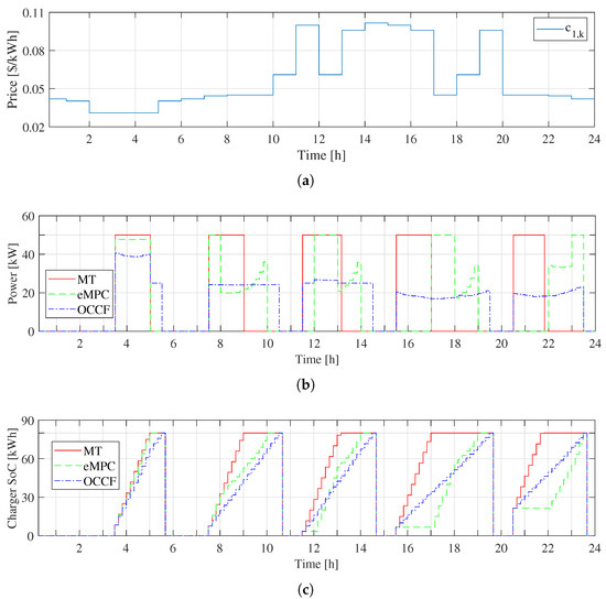 (in this case, no flexibility is possible from to ). Figure 3b depicts the power injected by strategies GC, MT, and MD for creating the SoC area. Note that there are no idle losses due to the short time horizon, and no negative power flows are considered as this work does not take into account V2G applications.