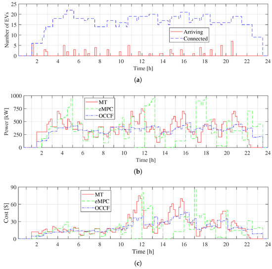In the eMPC and OCCF strategies, uncertain parameters such as EVs’ initial SoC at the arrival and their arrival times are considered. Both strategies are based on MPC formulations. The MPC strategy (also known as Receding Horizon Control) makes explicit use of a plant model to obtain the optimal control signal by minimising an objective function. MPC exploits forecast values together with new information to establish the future evolution of the system, handling the constraints in an efficient way. The main advantages of the MPC strategy are: (i) it introduces feed-forward control implicitly, to compensate disturbances and measurement noise rejection; (ii) it is not conceptually complex to treat the constraints over inputs, states, outputs and slew-rate variables; (iii) single-variable and multi-variable cases are easily treated; and (iv) it is appropriate to address single-objective and multi-objective control, and signal following.