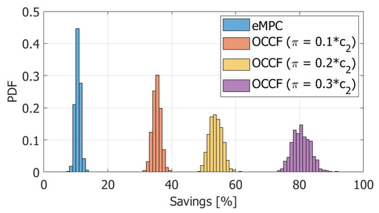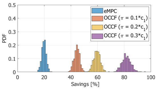 A comparison is introduced here in the form of parametric analysis, in which the remuneration factor is chosen at different percentages of the energy prices. In this way, the overall cost savings of providing flexibility with respect to the MT strategy are quantified. When the price sequence (see Figure 5a) is considered in the Monte Carlo simulation, the probability density function (PDF) of the overall savings is shown in Figure 10. The other cases for the OCCF strategy are formulated with remuneration factors of 10%, 20%, and 30% of the energy price (the further case with 100% is not shown but is included in Table 7). By definition, with null remuneration factor, the solution is the same as in the eMPC. By introducing remuneration, the energy costs of the different solutions increase, but the benefits due to remuneration are higher, and the solutions become more profitable. Indeed, when the remuneration is equal to the energy price, the overall savings are very high (even though these savings refer to the MT strategy, such values higher than 100% are conceptually feasible).