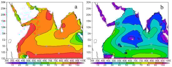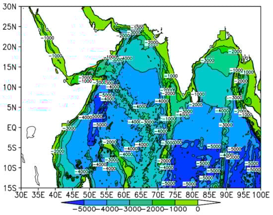 Earlier studies have shown that bathymetry is also an important factor []. Hence, ETOPO5 was used in the research, with range 15°S–30°N, 30°E–100°E, as shown in Figure 1. ETOPO5 is generated from a digital data base of land and sea-floor elevations on a 5-min latitude/longitude grid, and its values are in whole meters [].