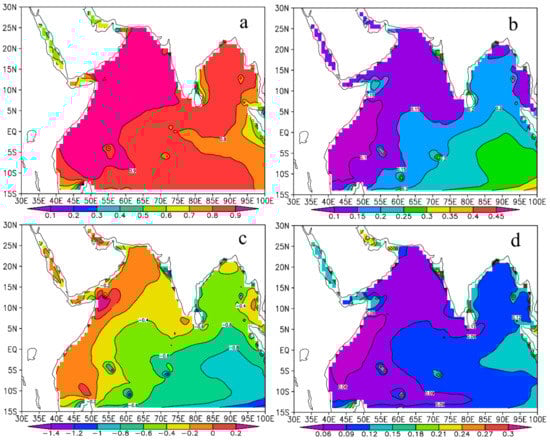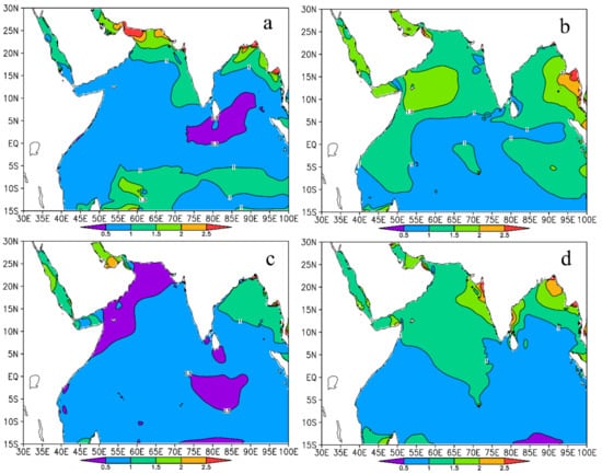 Coefficient of variation of wave energy density in (a) winter, (b) spring, (c) summer, and (d) autumn in the NIO.