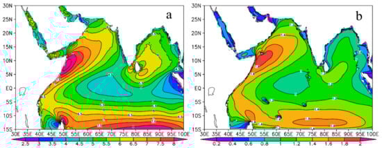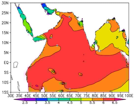 In order to analyze the wave energy distribution and stability in the NIO, ERA-interim wind data from European Centre for Medium-Range Weather Forecasting (ECMWF), including 10 m u wind speed (WS) and v WS was employed in the study. The advantage of the ERA-Interim is the latest global atmospheric re-analysis of the ECMWF [], which has been updated in real time since 1979. Coverage is global and spatial resolution options are varied. Referring to Kumar et al., wave height and wave period estimation depend on the accuracy of the wind field used to force the model [].
