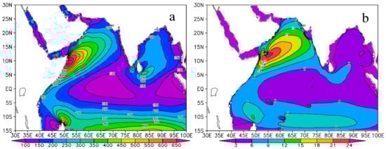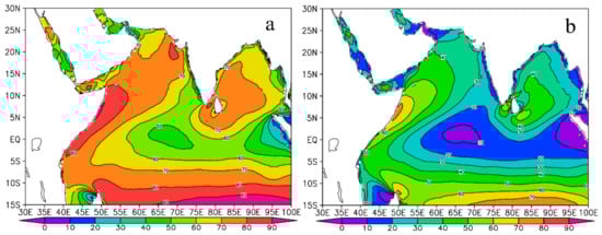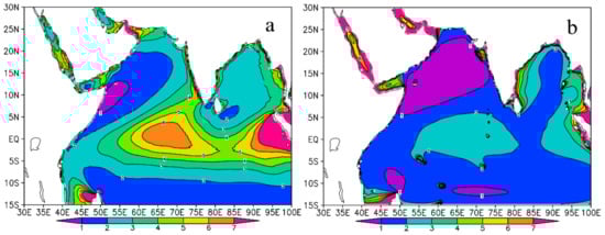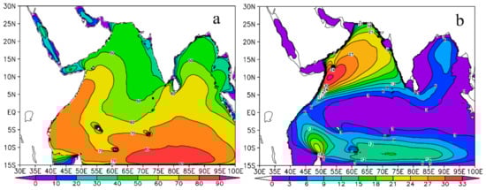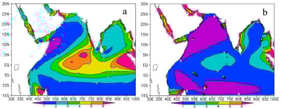 Wind and wave energy density Mv are calculated and shown in Figure 11 during 2008–2017. The monthly variations of wind energy density were bigger than the wave energy density. Most of the Ocean’s wind energy Mv was below 5.0, and the distribution is obvious, with large regional differences. Large-valued areas of wind energy Mv are usually found at the outermost point of the NIO. The lowest value of Mv was about 1.0, in the Somali Waters, and that in other regions are higher than 1.0, meaning that the Somali Waters are a good choice for the location of wind energy conversion equipment.