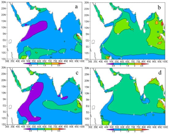 We can see that the WS and the SWH are closely related. If the value of WS in a region is large, that of SWH is also large. The areas with the biggest values of SWH were located in Somali Waters and Arabian Sea, where the range of values is spread between 1.4–1.8 m. The values in the northern part of Madagascar and the southern part of the Northern Indian Ocean were around 1.6 m. On the contrary, the Red Sea, the Gulf of Aden, and Persian Gulf were a little low, between 0.6–0.8 m.