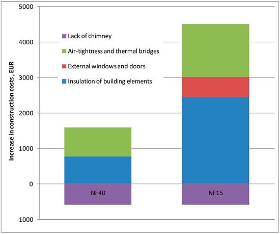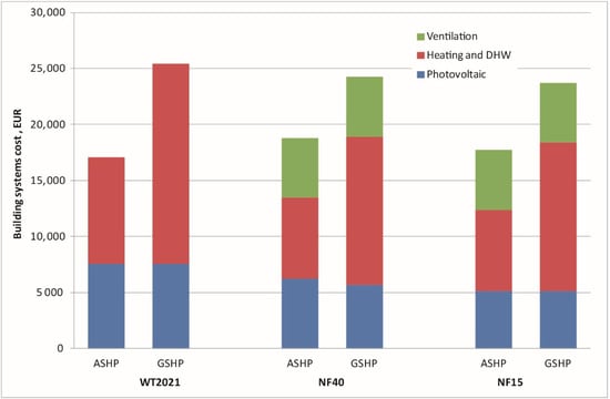 The last element of the building systems was in case of NF40 and NF15 the balance ventilation with heat recovery. The cost was calculated on a basis of an offer from PRO-VENT [41] company. It included installation of ventilation ducts, ventilation unit with heat recovery, regulation and commissioning of the entire system. NF40 and NF15 standards use the same type of ventilation unit, therefore the cost of EUR 5325for both variants is identical. The summary of all system costs for all standards is shown in Figure 4.
