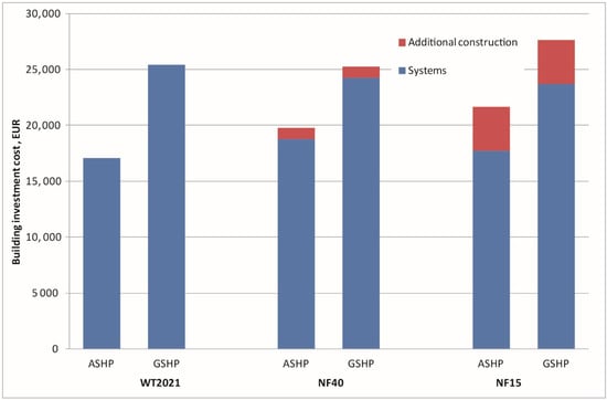 The total systems cost did not change much with the change of the building energy efficiency standard. Although the heat source capacity can be smaller the additional cost of balanced ventilation appeared. Higher differences could be seen in regard to the heat pump type. Use of ASHP reduced the costs from 23% to 33%. A full assessment of investment costs was possible after adding extra construction costs (Figure 5).