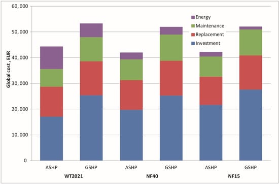 The aim of the global cost calculation was to determine the cost-optimal variant. The results depended on the energy efficiency standard and energy systems in the building. As an optimizing criterion, the minimal global cost (including investment + running costs) was used, calculated over a 30-year period. The calculations were based on the standard EN 15459-1 Energy performance of buildings, Economic evaluation procedure for energy systems in buildings, Part 1: Calculation procedures [16] and literature review [17,18]. The global cost for the 30-year period for the purpose of the study was calculated on basis of the following formula: