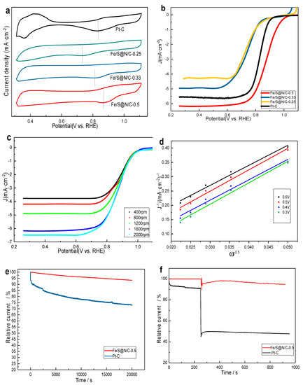The characterization of ORR activity for as-prepared Fe/S@N/C-x catalysts was estimated in O2-saturated 0.1 M KOH solution, respectively. At a scale of 0.2–1.0 V (vs. RHE), the cyclic voltammetry curves of Fe/S@N/C-x catalysts (Figure 3a) all had a distinct oxygen electro-reduction peak corresponding to a significantly larger current. Those peaks were in the order of Fe/S@N/C-0.25 (E(RHE) = 0.727 V) < Fe/S@N/C-0.33 (E(RHE) = 0.809 V) < Fe/S@N/C-0.5 (E(RHE) = 0.861 V), revealing the Fe/S@N/C-0.5 catalyst showed the most excellent ORR activity which was beyond the commercial Pt-C catalyst (E (RHE) = 0.836 V) [42]. Figure 3b,c demonstrates Linear sweep voltammogram(LSV)curves of Fe/S@N/C-x catalysts operated on RDE to further acquire the four-electron selectivity and kinetic current information, with 20% Pt-C as a reference. The sweep rate at various rotating speeds was 5 mV/s. The half-wave potential (E1/2) of the Fe/S@N/C-0.5 catalyst was 0.87 V, which is 0.13 V and 0.14 V more than Fe/S@N/C-0.33 and Fe/S@N/C-0.25, respectively, while the half-wave potential (E1/2) of the Pt-C catalyst was 0.84 V under the same test conditions. Further, at 1600 rpm, the Fe/S@N/C-0.5 catalyst also has a stronger diffusion-limiting current density (JL) of 6.16 mA·cm−1, which is 1.21, 1.85, and 0.56 mA·cm−1 more than the Fe/S@N/C-0.33, Fe/S@N/C-0.25, and Pt-C catalysts, respectively. In sum, the Fe/S@N/C-0.5 catalyst showed a surprising electro-catalytic activity. Furthermore, by chronoamperometric curve(i-t) tests (Figure 3e), the Fe/S@N/C-0.5 catalyst also showed better long-term stability compared with Pt/C at –0.4 V (vs. Hg/HgO). The current of Fe/S@N/C-0.5 catalyst decreased by less than 7% after 20,000 s, while it fell by 30% in Pt/C. For the methanol tolerance tests (Figure 3f), after methanol injection, the current value of the Fe/S@N/C-0.5 catalyst was almost constant with only subtle variations, while it attenuated greatly in Pt/C.