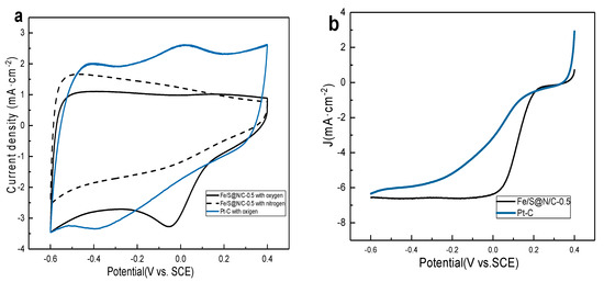 In order to investigate the catalytic activity of Fe/S@N/C-0.5 catalyst on the cathode for MFC, the cyclic voltammetry(CV)curves and LSV measurements were carried out in 0.01 M PBS solution with a pH value of 7 (Figure 4a,b supporting information). Traditionally, neutral PBS solutions are used as electrolytes for biological test systems [44]. As a control, the same experiments could also be done for 20% Pt-C. Figure 4a displays CV curves of Fe/S@N/C-0.5 in O2-saturated (solid line) and N2-saturated (dashed line) 0.01 M PBS solution with commercial 20% Pt-C (tested in O2-saturated 0.01 M PBS solution) as a reference. It is easy to visually observe the response from the ORR. The Fe/S@N/C-0.5 catalyst represents a pronounced cathodic ORR peak at –0.03 V vs. SCE as the PBS solution is saturated with oxygen. In contrast, there is no ORR peak in the nitrogen-saturated electrolyte, indicating that the Fe/S@N/C-0.5 catalyst owns excellent ORR catalytic activity in neutral PBS electrolyte. Rotating disk electrode (RDE) LSV experiments were also conducted in 0.01 M PBS solution for Fe/S@N/C-0.5 catalyst and commercial 20% Pt-C. The comparisons of the results at 1600 rpm are shown in Figure 4b. Encouragingly, compared with commercial 20% Pt-C, there was a more positive onset potential and a stronger limiting current in Fe/S@N/C-0.5 catalyst, which were higher than those of non-noble metal catalysts reported in the recent literature [45], further confirming the excellent ORR performance of the prepared Fe/S@N/C-0.5 catalyst in neutral PBS solution [46].
