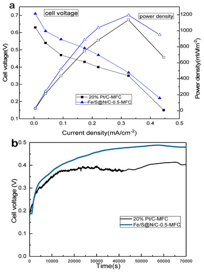 Overall polarization curves and power curves were operated when the open circuit voltage (OCV) was stable within the 1 mV range (Figure 5a). The Fe/S@N/C-0.5-MFC showed an OCV (0.71 V) that is 0.08 V superior compared to the Pt/C-MFC. On the whole, the voltage drop of the Fe/S@N/C-0.5-MFC was smaller than that of the Pt/C-MFC as the current density increased. This adds to the evidence that the Fe/S@N/C-0.5-MFC possesses a higher performance [49]. The power density curves prove the same conclusion, the maximum power density of Fe/S@N/C-0.5-MFC reached up to 1196 mW/m2, while that of Pt/C-MFC was 1137 mW/m2 under the same circumstances. The Fe/S@N/C-0.5-MFC had a 59 mW/m2 higher power density compared to Pt/C-MFC. Figure 5b exhibits the comparisons of the output voltage of these two devices. After these MFCs operated stably, their output voltage was detected. That value of Fe/S@N/C-0.5-MFC (~0.47 V) was 90 mV higher than that of Pt/C-MFC (~0.38 V). The combined abovementioned results indicate that the prepared Fe/S@N/C-0.5 catalyst owns excellent catalytic activity for air cathode MFCs [50].