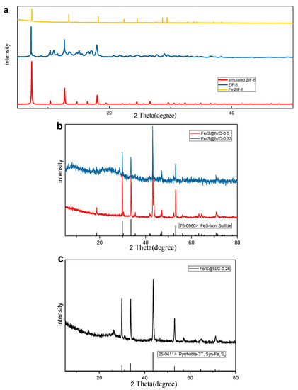 To further examine the physical properties, especially the crystalline structure of these carbonized materials (Fe/S@N/C-x) and the precursor (Fe-ZIF-8), XRD patterns shown in Figure 6 display a good graphical representation of this. It is observed that structures of the precursor (Fe-ZIF-8) and the initial ZIF-8 rebuilt in our work coordinate well with that of the simulated ZIF-8 (Figure 6a). They all exhibit similar diffraction peaks, implying that no change compared to the crystal structure of pristine ZIF-8 is detected after the introduction of the iron source. For Fe/S@N/C-x, after being doped with thiourea and calcined twice at a high temperature, the original peaks vanish; instead, some new diffraction peaks are created. In the diagram (Figure 6b), these synthesized composites, Fe/S@N/C-0.5 and Fe/S@N/C-0.33, both show typical sharp peaks at around 29.8°, 33.7°, 43.2°, and 53.2°, coinciding with (110), (112), (114), and (300) of FeS (JCPDS No. 76–0960) respectively, confirming the correct generation of FeS [51]. The diffraction peaks of Fe/S@N/C-0.5 are stronger than those of Fe/S@N/C-0.33, suggesting that Fe/S@N/C-0.5 had better crystallinity of FeS, which is favorable to accelerate the ORR process according to the electrochemical test analysis and results above. In contrast, Figure 6c shows that the phase of Fe/S@N/C-0.25 that shows a poor performance in electrochemical tests is not FeS.