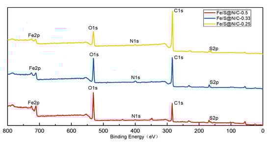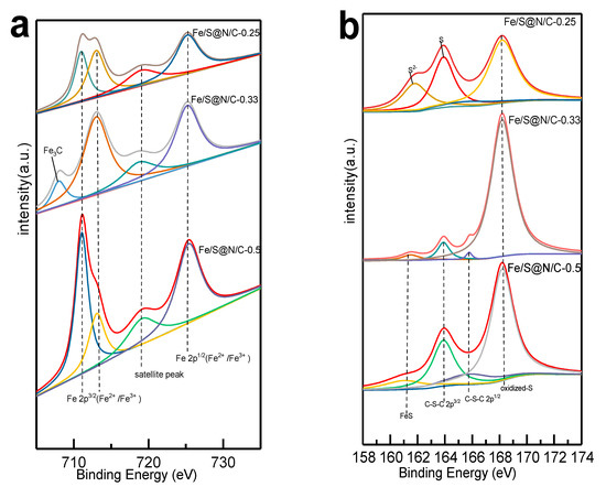 X-ray photoelectron spectroscopy (XPS) was employed to clarify the detailed chemical profiles for all sorts of elements in Fe/S@N/C-x, and the data were plotted in Figure 7 and Figure 8. Survey spectra in Figure 7 confirm the existence of Fe, O, N, C, and S elements in all Fe/S@N/C-x samples. The photoelectric peaks of the N 1s spectrum imply the presences of pyridinic N, pyrrolic N, and graphitic N [52] with a binding energy center at 398.6, 400.1, and 401.8 eV, respectively (Figure 8c supporting information). In Figure 8b, the S2p spectra of Fe/S@N/C-0.5 and Fe/S@N/C-0.33 samples’ main crystal phases of FeS could both match well with the C-S-C chemical bonding; the peaks at 163.8 eV and 165.7 eV correspond to S 2p3/2 and S 2p1/2, respectively. The appearance of C-S-C bond confirms that S atoms were successfully incorporated into the structure of aromatic carbon, the active site of which is believed to be thiophene S [53]. The binding energy of 161 eV is related to FeS, and another peak at 168.2eV corresponds to SOx. The deconvoluted Fe 2p spectra in Figure 8a show the formation of Fe 2p3/2 (Fe2+/Fe3+) and 2p1/2 (Fe2+/Fe3+) in all Fe/S@N/C-x samples at approximately 711–713 and 716.5 eV, respectively. The powerful interaction between Fe2+ and S species could give rise to the production of FeS [54,55]. It is widely reported that these nanoparticles could be the active sites for ORR performance [56]. For Fe/S@N/C-0.33, an extra weaker peak at 708.4 eV emerges, which is matched with Fe/Fe3C. For the last few years, many studies have shown that the catalytic activity could be significantly diminished when Fe3C exists [57], and the same is true for aggregate Fe particles. Hence, the Fe/S@N/C-0.33 catalyst displays a weaker ORR performance compared with Fe/S@N/C-0.5, even though their main phases are the same (FeS). As for the C 1s spectrum of the Fe/S@N/C-0.5 and Fe/S@N/C-0.33 samples, the binding energy values of 284, 286, and 286.3 eV are relevant to C-C, C-N/C-S/C-O and C = O/C = N, respectively (Figure 8d). Additionally, as shown in the table of the proportion for each element (Table 4), the atomic contents of S and Fe are proportional in Fe/S@N/C-0.5, and both are the highest among the three samples. Within a certain concentration range, the ORR activity increased with the increase of the Fe content, and similar conclusions have been reached in some previous research [58]. Corresponding to the electrochemical properties tested above, it can be clearly seen that the content of S also has a positive correlation with the ORR activity. That is, Fe/S@N/C-0.5 (S% = 6.63) > Fe/S@N/C-0.5 (S% = 4.32) > Fe/S@N/C-0.5 (S% = 3.97), and the sum of the contents of Fe, N, and S follows this order as well.