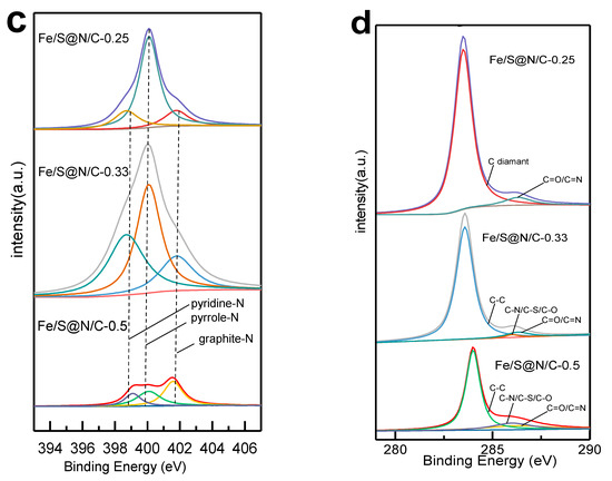 (a) High-resolution Fe 2p XPS spectrum of Fe/S@N/C-x. (b) High-resolution S2p N1s XPS spectrum of Fe/S@N/C-x. (c) High-resolution N1s XPS spectrum of Fe/S@N/C-x. (d) High-resolution C1s XPS spectrum of Fe/S@N/C-x.