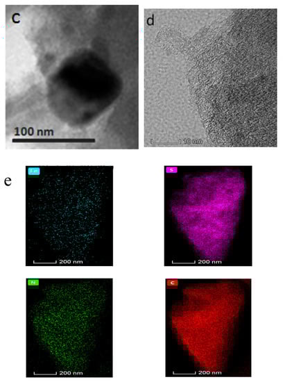 Scanning electron microscopy (SEM), transmission electron microscopy (TEM), and elemental maps of Fe, S, C, and N were employed to probe the structure and morphology of the Fe/S@N/C-0.5 catalyst. As shown in Figure 9a–c, the classical octahedral structure of ZIF-8 [59] remained in Fe-ZIF-8 and Fe/S@N/C-0.5 materials with a uniform size of ~80 nm, confirming that carbonization at a high temperature and modification processes such as S doping and acid etching could not destroy the original structure of the MOF. According to the SEM images, the surface morphology of the Fe/S@N/C-0.5 catalyst became rough compared with Fe-ZIF-8. No crystalline iron species and aggregated sulfur atoms are found in the TEM image (Figure 9d). Besides, based on the elemental mapping images of Fe/S@N/C-0.5 (Figure 9e), it is clear that Fe, N, S, and C are successfully dispersed uniformly in the material. These analyses correspond to the atomic-level dispersion of Fe, S, and N in Fe/S@N/C-0.5 materials and could promote the ORR activity [60,61].