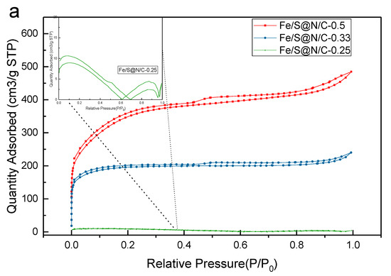 According to the N2 adsorption/desorption measurements at –196 °C, Fe/S@N/C-0.5 is quite different from the other two Fe/S@N/C-x (0.33, 0.25) in terms of the surface pore characteristics. Table 5 shows the details. The BET and Langmuir surface areas of the Fe/S@N/C-0.5 catalyst are 598 m2/g and 704 m2/g respectively; both of them are highest compared with the other two Fe/S@N/C-x (0.33, 0.25). As the graph (Figure 10a) shows, the N2 sorption isotherms of Fe/S@N/C-0.5 material contain the characteristics of typical type I and type IV isotherms [62], which shows a sharp increase in the low relative pressure and an obvious hysteresis loop in higher relative pressure, illustrating that mesopores (2–50 nm in diameter) and microporous (less than 2 nanometers in diameter) structures are present. By using the t-plot method and the Barrett–Joyner–Halenda (BJH) model, the pore size distribution curves were generated (Figure 10b supporting information) and further illustrate that the Fe/S@N/C-0.5 material contains a mass of micropores and mesopores. As seen in Table 5, it is clear that the pore diameters of the Fe/S@N/C-0.5 material are mainly distributed around 1.8 nm (micropores) and 7.5 nm (mesopores). Unlike the Fe/S@N/C-0.5, the Fe/S@N/C-0.33 and Fe/S@N/C-0.25 contain only micropores the diameters of which are 1.8 nm.