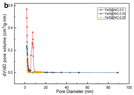 (a) N2 adsorption/desorption isotherms of Fe/S@N/C-x. (b) Pore size distribution data obtained by the Barrett–Joyner–Halenda (BJH) method of Fe/S@N/C-x.