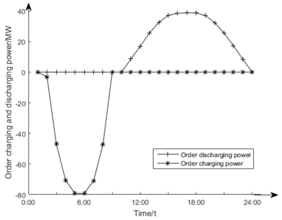 Assuming that there are 20,000 EVs participating in the joint scheduling in the area, according to Equations (28)–(30), the orderly charging and discharging power curve of the EVs obtained by Using Monte Carlo simulation method to simulate the driving behavior of the vehicles [36] is shown in Figure 1.