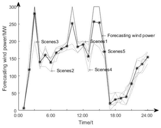 Assume there are 100 wind turbines in a certain wind farm participating in system scheduling. The rated output of each generator is 3 MW, and all wind turbines maintain the same wind effect. The wind power can be simulated for the whole day by scenario analysis. First, the wind speed is predicted by the autoregressive moving average model [37], in which the autoregressive parameter is 0.78 and the moving average parameter is −0.34. Secondly, the Latin hypercube layered sampling method is used to sample the predicted wind speed. Then, the scene reduction technique is used to reduce to five scenes. Finally, through the relationship between the wind power and the wind speed, the wind power forecasting output data and its probability are obtained throughout the day in five scenarios [38]. The forecasting wind power curve is shown in Figure 2.