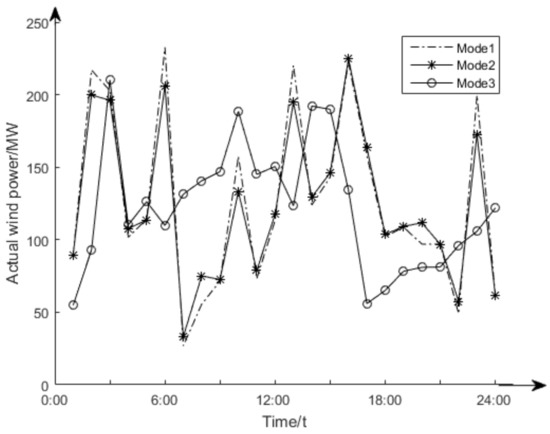 Mode 1 is the determined wind power forecasting data. For the sake of simplicity, the wind power forecasting data scene 1 in Mode 2 was used as the determined wind power forecasting value.