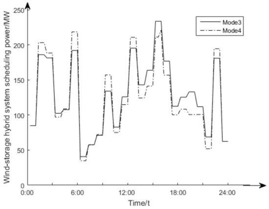 As an important load in the demand response range, EVs can be used as distributed energy storage devices to dissipate excess wind power through V2G technology. To verify the optimization effect, setting Mode 4 is to optimize the wind power output forecasting data simulated by the Mode 2 using the IGDT, but the EVs do not participate in the wind–storage–EVs hybrid system joint scheduling. When the deviation factor is 0.3 and the robustness coefficient is 0.211, the minimum wind power of Modes 3 and 4 is as shown in Figure 5.