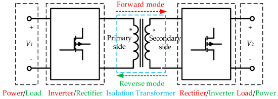 Bidirectional DC/DC converters (BDCs) play an important role in many fields, including new energy generation systems, electric vehicles, aerospace power supplies and uninterruptible power supplies. An isolated type of BDC is usually accepted instead of a non-isolated one, as shown in Figure 1, since the aforementioned fields have strict requirements for safety.