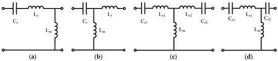 Structures of resonant tanks of different types. (a) Type-4, i.e., LLC; (b) Type-11; (c) CLLLC; (d) CLLC.