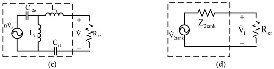 The equivalent circuit of the forward mode is shown in Figure 4a, where is the normalized capacitor of , and is the normalized equivalent AC resistance of the forward-mode load . It can be further converted into the topology in Figure 4b based on Thevenin’s theorem, where the equivalent tank voltage and the total tank impedance can be derived as: