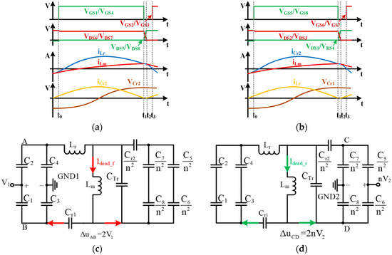 In order to realize ZVS of the inverter-side switches, their parasitic capacitors should be completely charged and discharged within the dead time. In contrast to ZVS conditions in [6,14], an improved condition of ZVS with relevant parasitic parameters and dead-time processes of both the forward mode and the reverse mode taken into account is provided in this paper. Based on the operation principles of CLLC-BRC, the following assumptions were made: