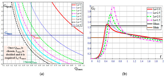 After ratio n and was obtained, we preset a . Then, and needed setting. It was better to obtain the curves of relation between and peak normalized DC gain of the forward mode with parameter sweep of , as shown in Figure 8a. Setting was limited by , which shall be considered when setting . A proper can be further decided by Figure 8b after is set. It needed to be guaranteed that the forward-mode dc gain range was met within , where was the designed maximal normalized operating frequency. In other words, was determined by and the requirement of DC gain range. It was well expected that and are not far away from the normalized resonant frequency decided by and to decrease loss. A drop in Ln will lead to a rise in the steepness of the gain curve and thus decrease in |fmax − fmin|, but it will also lead to rise in excitation current and dead-time loss. If it is hard to get proper and , the previous steps need to be redone. It was noted that needed to be further verified and adjusted in combination with the reverse mode due to its effect on .