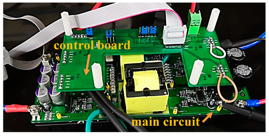 The structure of the prototype is shown in Figure 9, with its performance shown in Table 2, and its main components shown in Table 4. It used TI’s UCD138 as a digital controller of the converter on the control board. Compared with the DSP/MCU completely managed by software like TMS320F28335 used in [9], UCD138 has access to high-speed control circuit, multi-loop control and solution of SR, with its three modes switched automatically to meet the requirement of SR in variable frequencies. In the high-voltage side, the isolated driving chip Si8273 was accepted to drive GaN transistors. In the low-voltage side, the non-isolated chip TI’s LMG1205YFXR was used as a driver. The dead time was set as 100 ns based on the used GaN transistors.