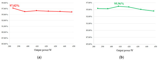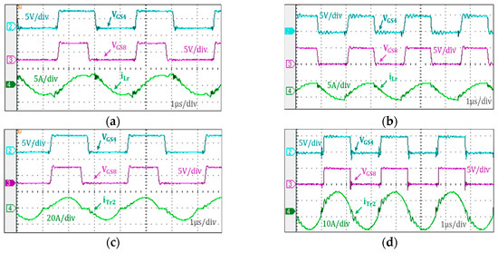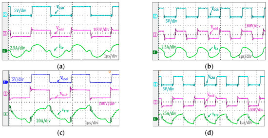The experimental results show that the operating frequency range was of the forward mode, and it was of the reverse mode. Main waveforms at the maximal and minimal operating frequencies of the two modes are shown in Figure 10 and Figure 11, where is the current of the high-voltage side and is the current of the low-voltage side. ZVS of GaN transistors of the whole operating frequency range in the inverter side can be realized in both the two modes. ZCS of GaN transistors in the rectifier side can be realized when , but cannot be realized when , as shown in Figure 10c,d for the forward mode and in Figure 11c,d for the reverse mode. As shown in Figure 12, the converter achieved a maximal efficiency of 97.02% in the forward mode with the output power of 384 W, and achieved a maximal efficiency of 95.96% in the reverse mode with the output power of 408 W. Efficiency of more than 95% was achieved near the rated power of 400 W in the two modes.